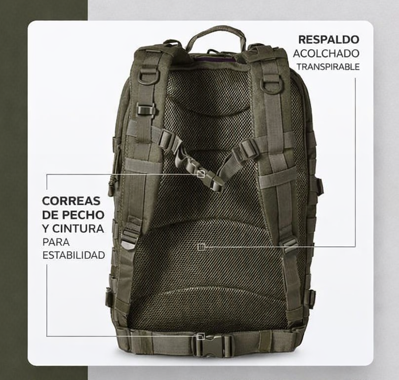 Me sorprendió la calidad de los materiales, mucho mejor que otras marcas más caras. El sistema molle es súper práctico para colgarle cosas. Es cómoda incluso cuando va bien cargada. El color verde es hermoso, súper sufrido para el campo.